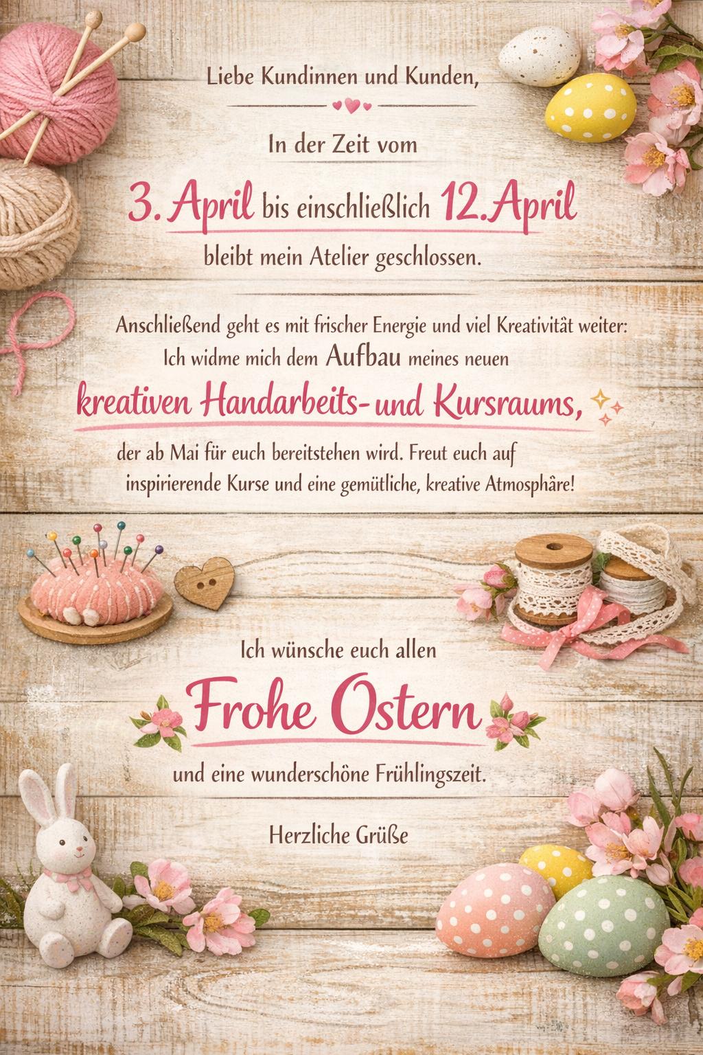 Atelier vom 03. - 12. April geschlossen. weitere Informationen hier.
